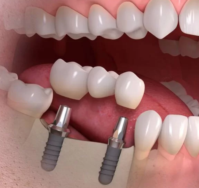 Por ejemplo, en el caso de perder tres piezas dentales contiguas, se colocan dos implantes y tres coronas unidas entre sí, evitando colocar un implante por cada diente.